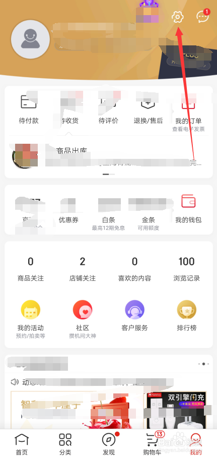 在京东我的界面里直接点击右上角的齿轮状【设置】图标,如下图所示。