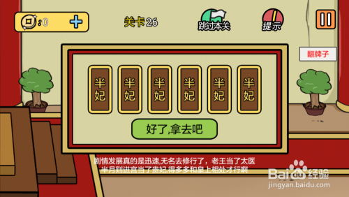 第26关长按半妃牌子,然后点击复制,将所有牌子都酿成半妃牌子后,点击好了拿去吧就过关了。