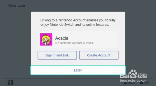 在将任天堂在线帐户添加到新帐户或选择Later之间进行选择。