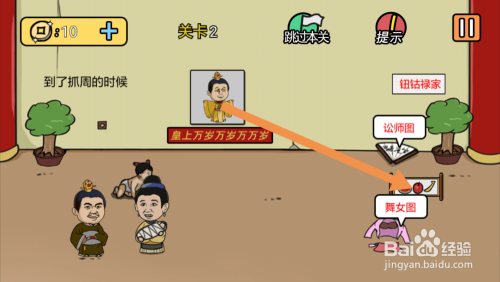 第2关将皇上的画像拖动到生果处就可以过关了。