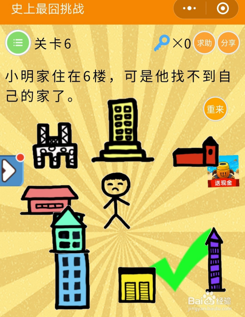 史上最囧挑战第三季6关谜底:将图中绿色的楼移动到蓝色楼上方,如许就酿成6层楼了,孩子便能回家了。