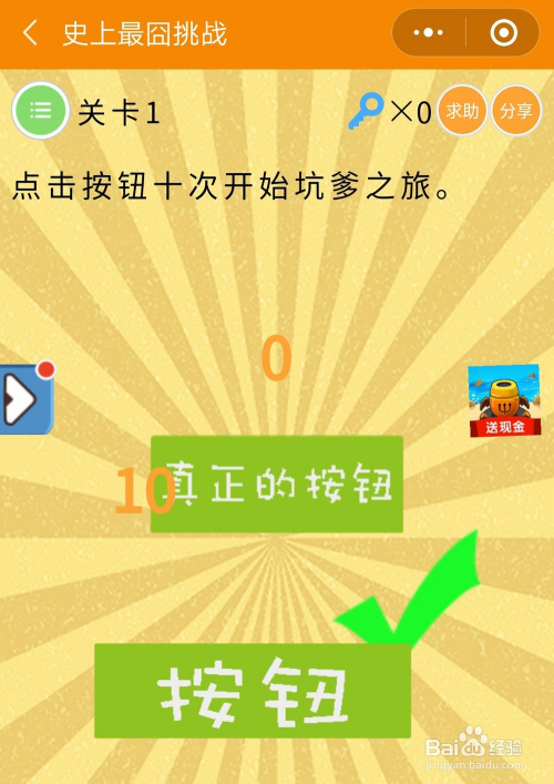 史上最囧挑战第三季1关谜底:这一关比力简单,将屏幕上的按钮挪开便能看到一个真正的按钮,点10下就OK了。
