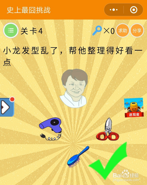 史上最囧挑战第三季4关谜底:摇摆手机,图中人物的刊行就变好了,摇手机暗示甩下头,发型天然整洁。