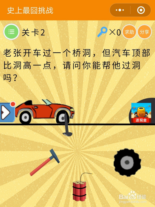 史上最囧挑战第三季2关谜底:用图中的钉子将汽车的轮胎扎破,车身下降,如许就过关了。