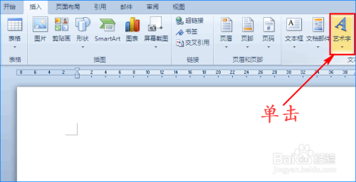 打开Word文档,我们点击“插入”菜单,在其子项中找到“艺术字“选项。如图所示: