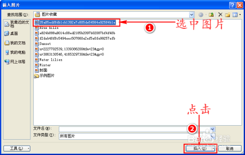 接着在“插入图片”对话窗中我们选中需要填充的图片,再点击“插入”按钮,最后封闭所有弹出的对话窗,如许文档中的文字就填充图片布景了。如图所示: