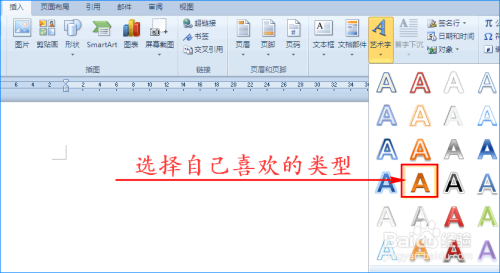 单击”艺术字“选项,接着在扩展框中选择本身喜好的艺术字类型,这时文档中就呈现了艺术字编纂框。如图所示: