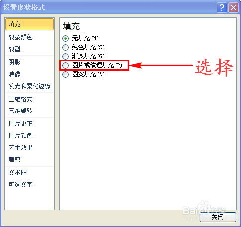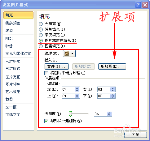 在对话窗中我们选择”图片或纹理填充“,如许就会呈现扩展项。如图所示: