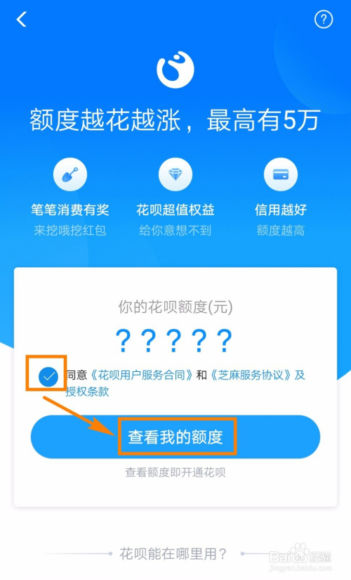 这时进入到花呗界面,在界面中勾选和谈,然后点击【查看我的额度】。