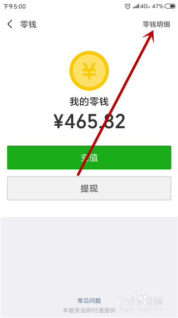 进入到零钱界面中可在右上角看到【零钱明细】,点击打开零钱明细。