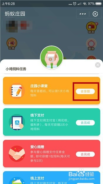 回覆准确问题即可点击【去领取】,从而返回到领饲料使命中点击领取饲料。