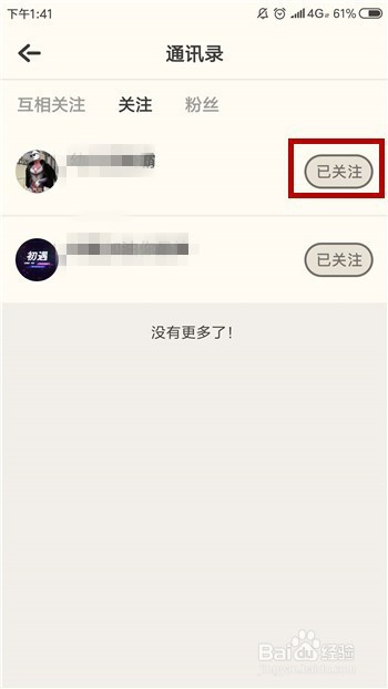 如许就可以打开存眷列表了,找到想要打消存眷的人并点击后方的【已存眷】。