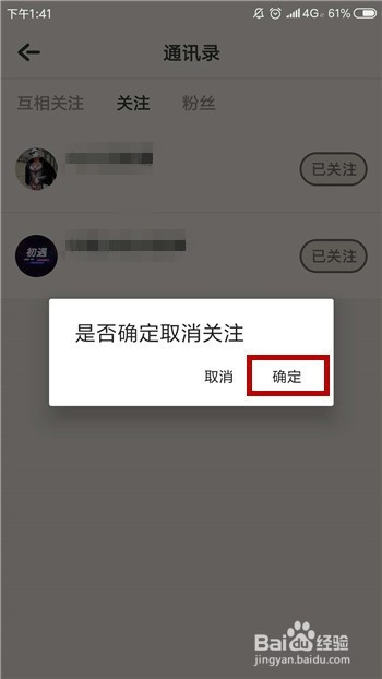 接下来就会提醒我们是否打消存眷,点击【确定】即可打消存眷。