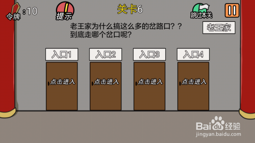 第6关先点击进口4,接着点击进口2,然后点击进口1,最后点击门4就过关了。