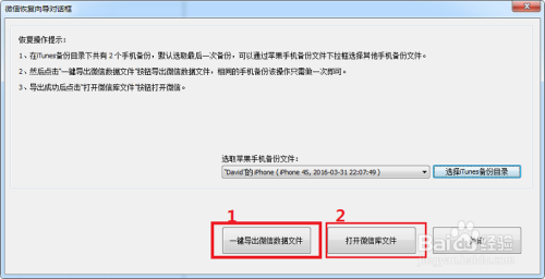 如下图点击“点击“苹果微信恢复”按钮,将会弹出“微信恢复标的目的导”对话框。