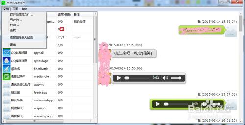 双击左侧微信用户,右侧将会显示当前用户的聊天信息,下图中红色方框中的“3”暗示恢复出来的已被删除的聊天记实的数目。