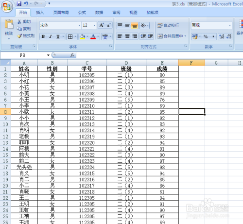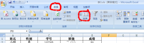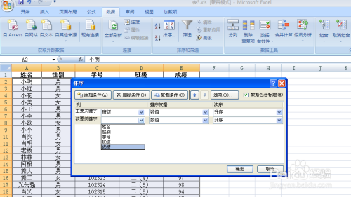 如下图我们打开一个表格,我们一路来设置下表,同时按“班级”升序,“成就”降序多重排序。
