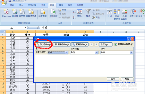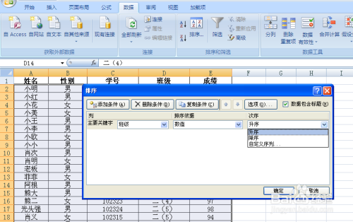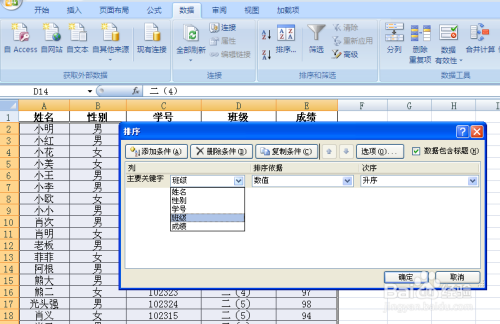 点击“本家儿要关头字”的下拉菜单,选择“班级”,在右侧次序下拉菜单,选择“升序”。