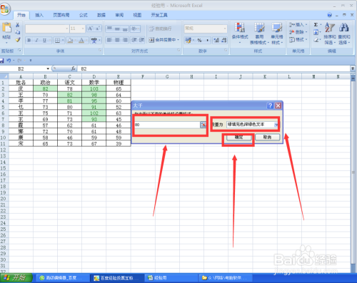 在“年夜于”对话框中,输入前提“80”,“设置为”后面选择“绿填充色深绿色文本”(可以自由设置)。设置完当作,单击“确定”