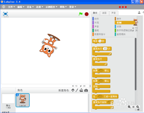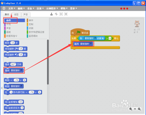 点绿旗,脚色就会跟随鼠标活动,我们就可以用鼠标节制对象活动了。