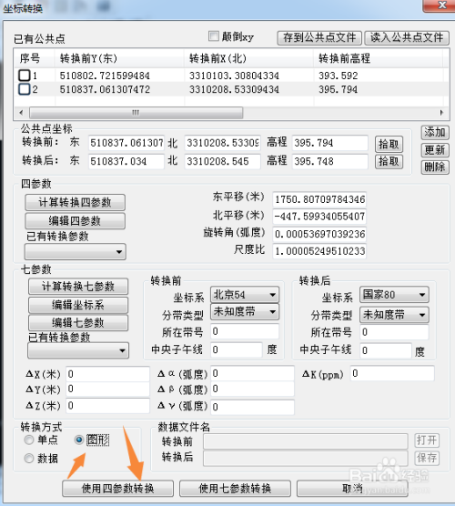 第七步:转换体例选择 图形。然后点击 利用四参数转换。
