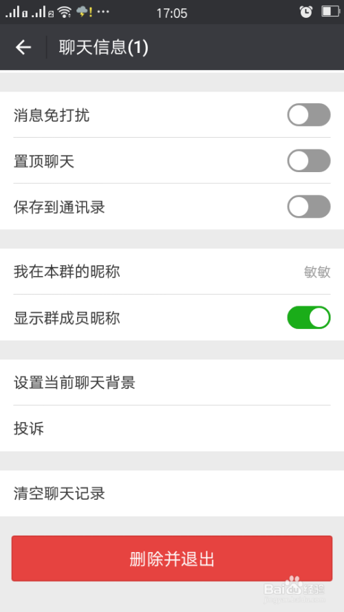 将所有人都删除完后,可以看到群里只剩下群本家儿 你本身了。如图,将页面滑到最下面来。点击删除 并退出。这个群才算彻底闭幕当作功。