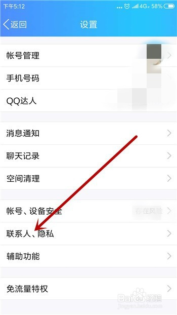 打开了设置功能后找到并点击【联系人、隐私】功能设置。