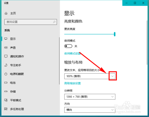点击显示设置后便会呈现显示设置页面,在页面中找到缩放与结构,然后在其下方点击图示位置的下拉箭头。