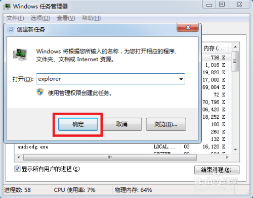 在输入栏中输入【explorer】并点击下方的【确定】按钮。