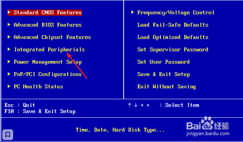 进BIOS看到右侧,选择【Intergrated Peripherials】。