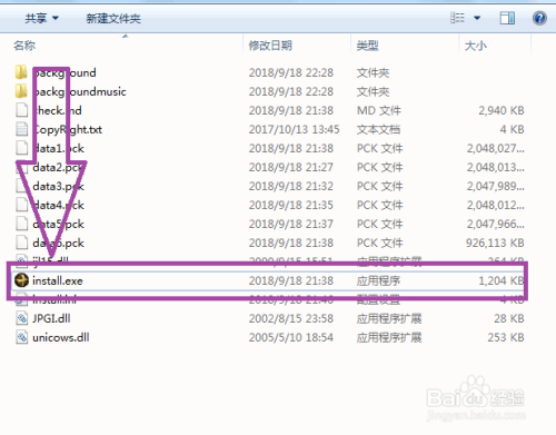 双击解压后的游戏文件夹,进入到查看游戏文件夹内的文件和文件夹,在游戏文件夹内我们可以找到“install.exe”。