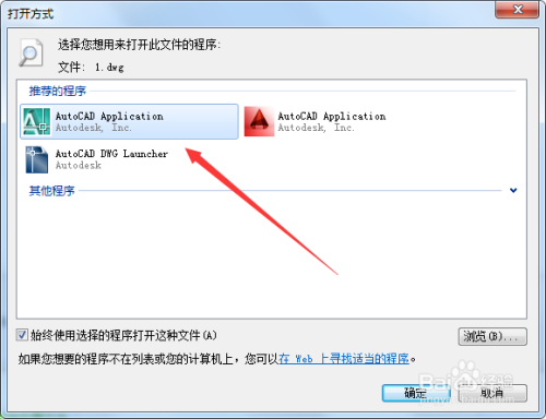 在“保举的法式”中我们选择适才找到的CAD运行法式,然后点击确定,文件就被打开了,如图所示。