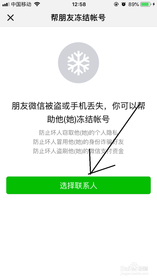 打开帮伴侣冻结帐号界面中点击选择联系人按钮。