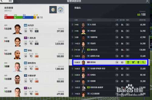 之后,鄙人方点击办理球团球员,我们可以看到采办的球员呈现在预备队里,采办的球员可以利用也可以当材料利用,这就是FIFA OL4采办球员的方式。