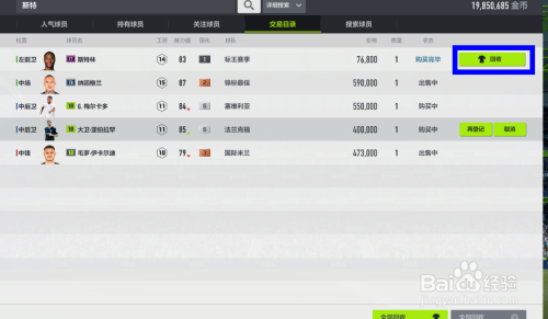 采办后,我们选择买卖目次,看到方才采办的球员,这时辰单击这个球员,看到后面有收受接管选项,点击一下。