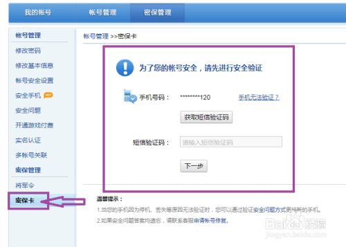 平安验证完毕后,我们就可以进入到我们的账号中间了,在页面的左侧我们可以看到在账号办理下有“密保卡”,点击“密保卡”进入到绑定密保卡页面,获取并输入短信验证码,进行平安验证。