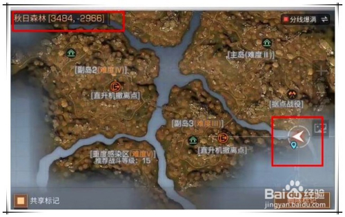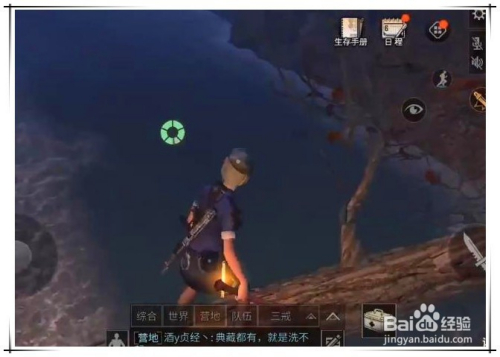 首先,来到秋天丛林,如图所示的位置,找到一棵伸标的目的河中的树,跳到上面。