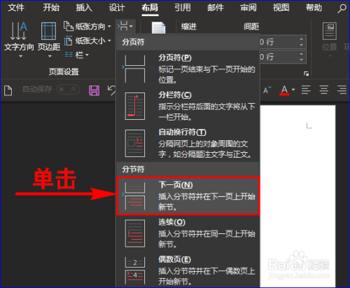 单击“分隔符”选项,再在扩展框中“分节符”的下方选择“下一页”,这时文档中会呈现一个新的页面。如图所示: