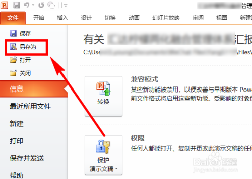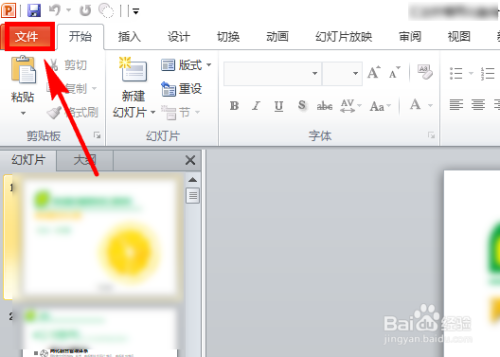 将你的文件发给安装有高版本软件的人,请求他将文件进行转换。转换的体例为:打开文件,点击ppt坐上角的【文件】菜单。