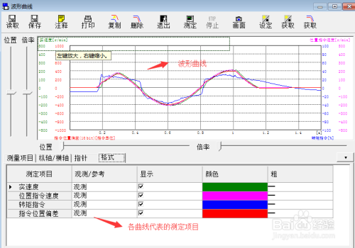 打消“转矩指令”和“指令位置误差”的曲线图,不雅察及时速度和位置指令速度的曲线图,这两条曲线重合度越高,定位越精确。(位置指令速度:驱动器收到的定位速度;及时速度:驱动节制电机扭转的速度)
