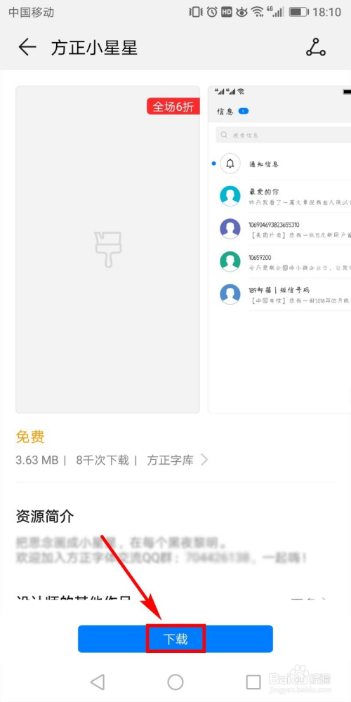 点击字体后就进入其简介、预览及下载页面了,在页面底部点击【下载】。