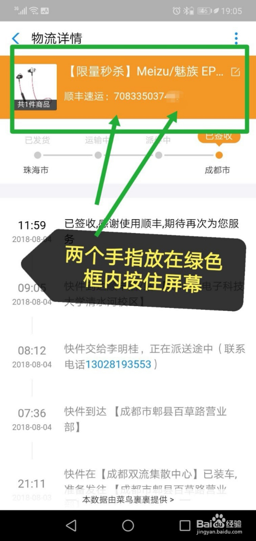 请打开可以或许浏览快递信息的APP(好比在某宝上采办,就在某宝APP上查看),查找到快递单号,然后用两个手指同时按压快递单号区域的屏幕。