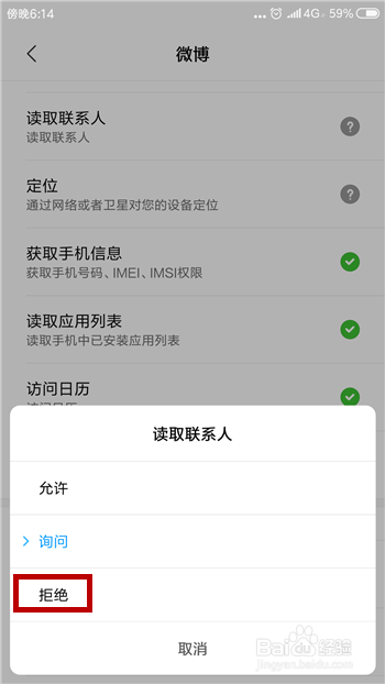 接着点击打开微博的权限设置界面,把【读取联系人】的权限设置为【拒绝】即可。