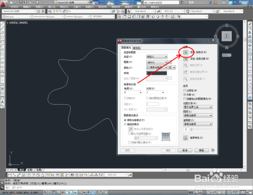 点击【图案填充】,弹出图案填充设置框,选择一种样例图案,按图示设置好参数后,点击【添加.拾取点】对图案进行填充,完当作后点击【确定】(如图所示);