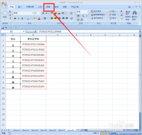选中所有的身份证号码,找到菜单栏中的“数据”单击