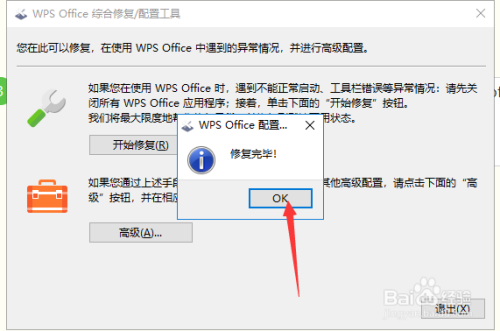 封闭电脑上打开的所有WPS文档后,在弹出的设置装备摆设东西窗口点击起头修复按钮,很快界面上会显示修复完毕。
