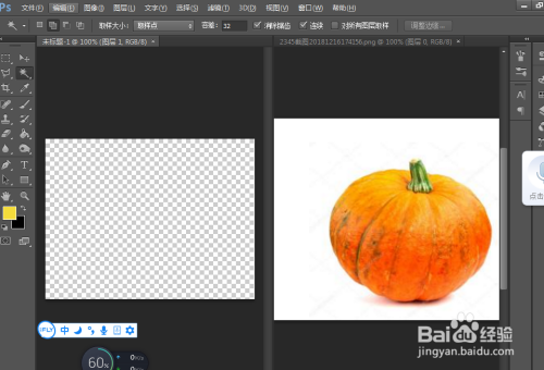 我们再新建一个图片,布景色为透明色,点击上面菜单窗口----并列----双联并列,把两个图片,并排摆列,点击移动键,把南瓜移动到透明布景的图片上