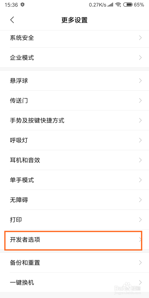然后,找到开辟者选项,点击一下。(不知道怎么开启开辟者选项的可以点击下面的链接)