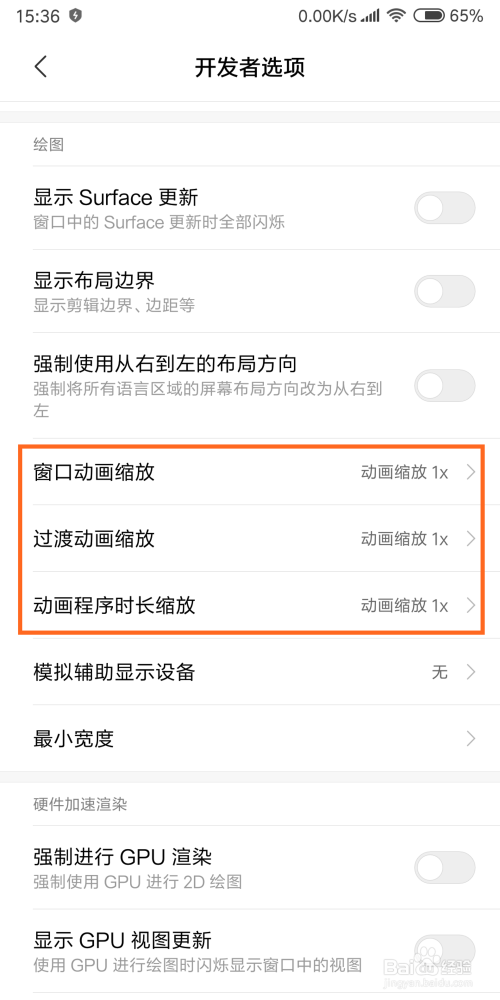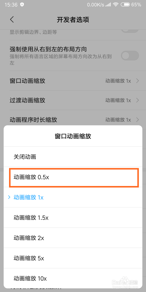 之后我们可以看到默认是动画缩放1×,我们选择动画缩放0.5×,三者都这么选择就可以了,是不是速度变快了呢。
