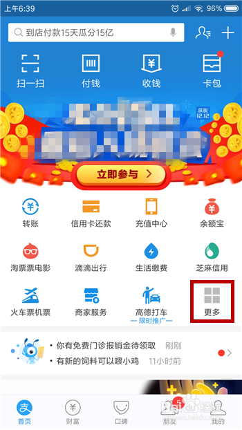 在打开付出宝后找到【更多】选项并点击打开应用界面。